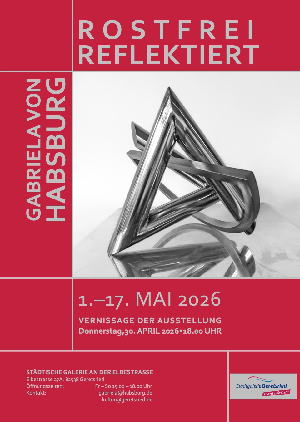 Gabriela von Habsburg creates mainly nonfigurative stainless steel sculptures. She also composes Lithographs using the original craft technique. Every year she holds several international exhibitions. Since the 1990s she has notably been active in several Eastern European countries in addition to working in the US and other parts of Europe.